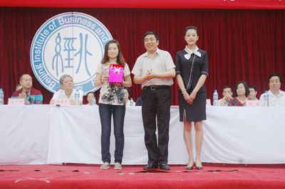董事长、院长周宏教授为全国职业院校技能大赛英语口语技能比赛二等奖获得者外语系龚丹丹同学颁发奖杯及纪念品;院党总支书记李平为2009——2010年度北京市先进集体、北京市三好学生、北京市优秀学生干部获得者颁发奖状。