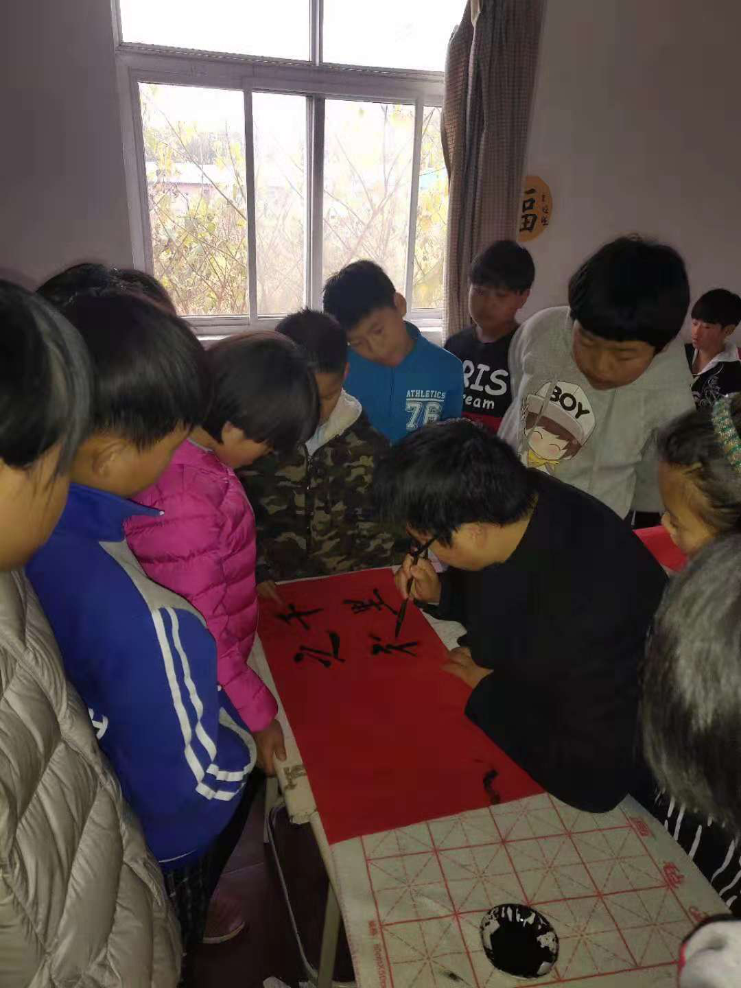 当书法专家刘老师亲自示范成语写法时,孩子们都着急的围了过去,生怕错过老师的讲解。