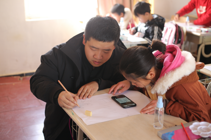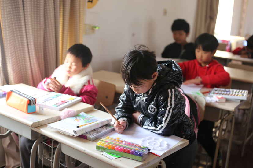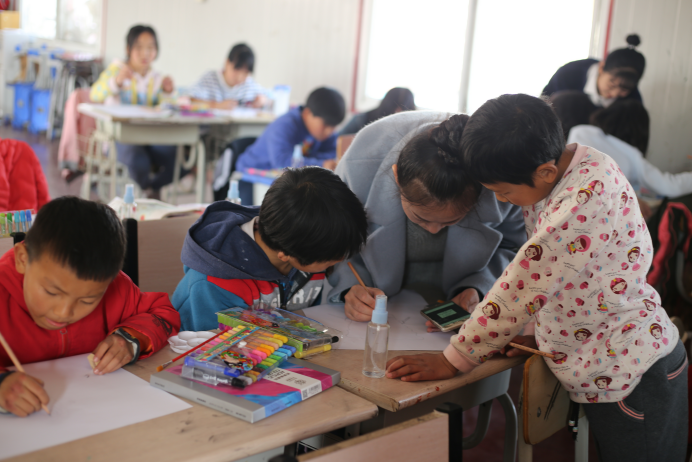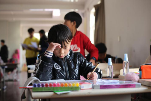 孩子们认真的画画,志愿者和老师们的耐心指导,形成了一个非常有爱的绘画小课堂。