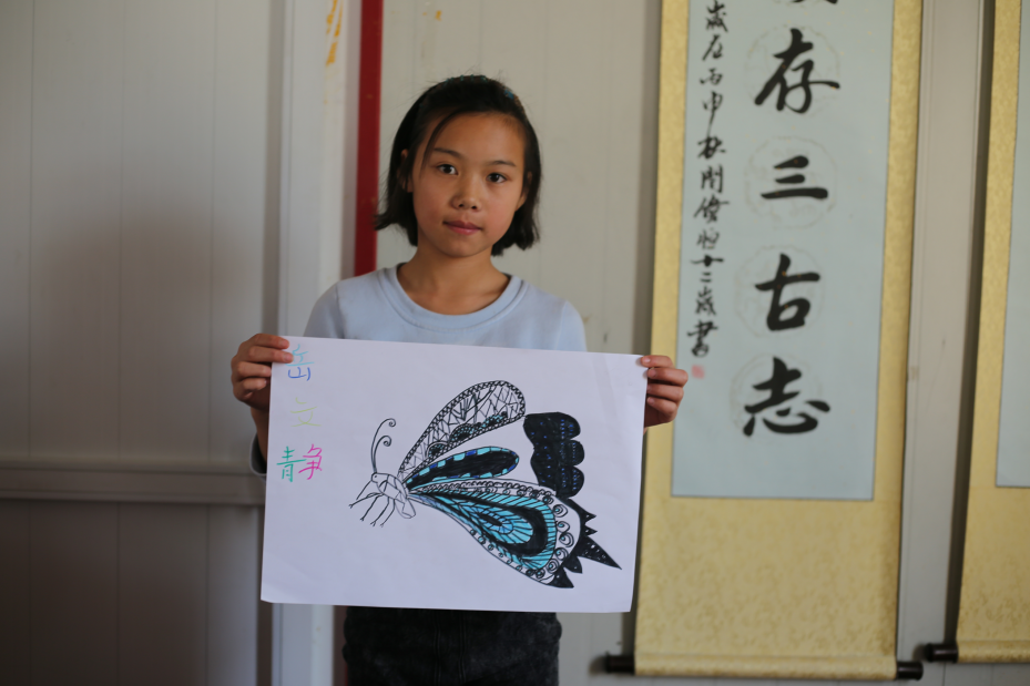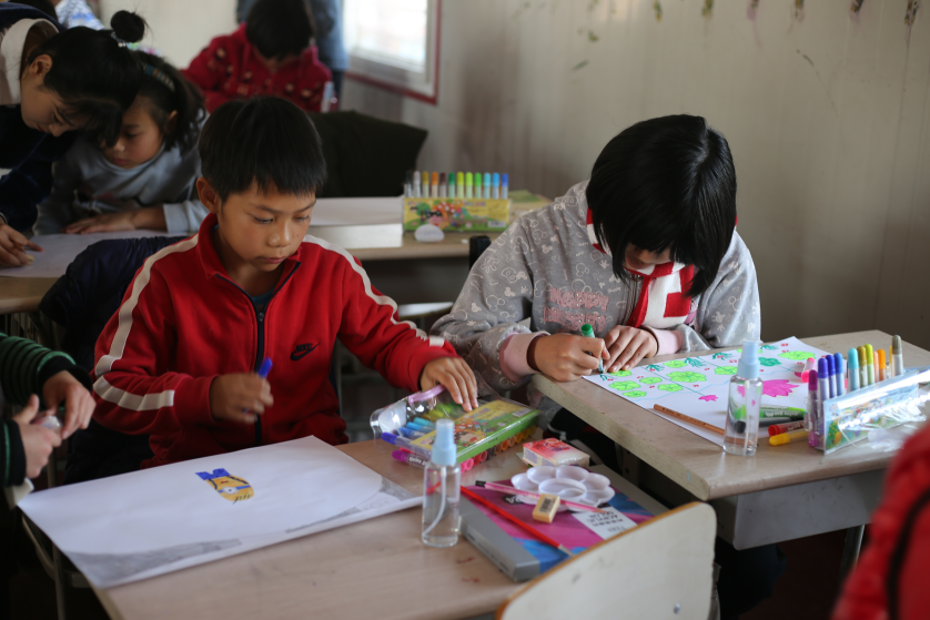 他们不懂就非常有礼貌的举手提问。整节课上荡漾着孩子们叫“哥哥、姐姐”的声音,——“姐姐,狐狸怎么画?”“哥哥,汽车应该是什么颜色?”“老师,我想画奥特曼”......,把在场工作的志愿者和老师们都忙的“不可开交”。
