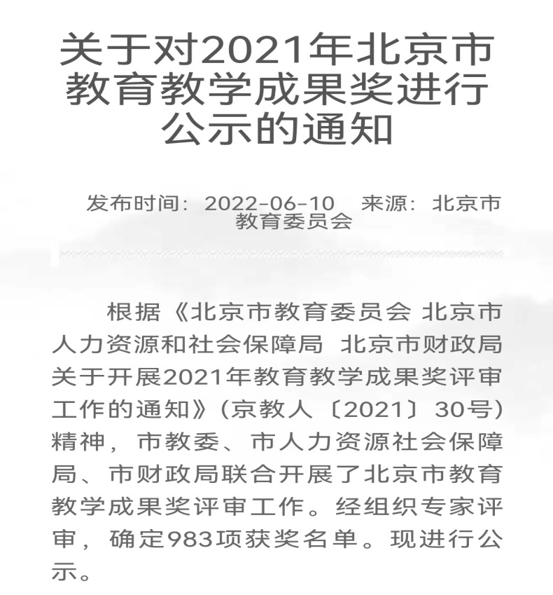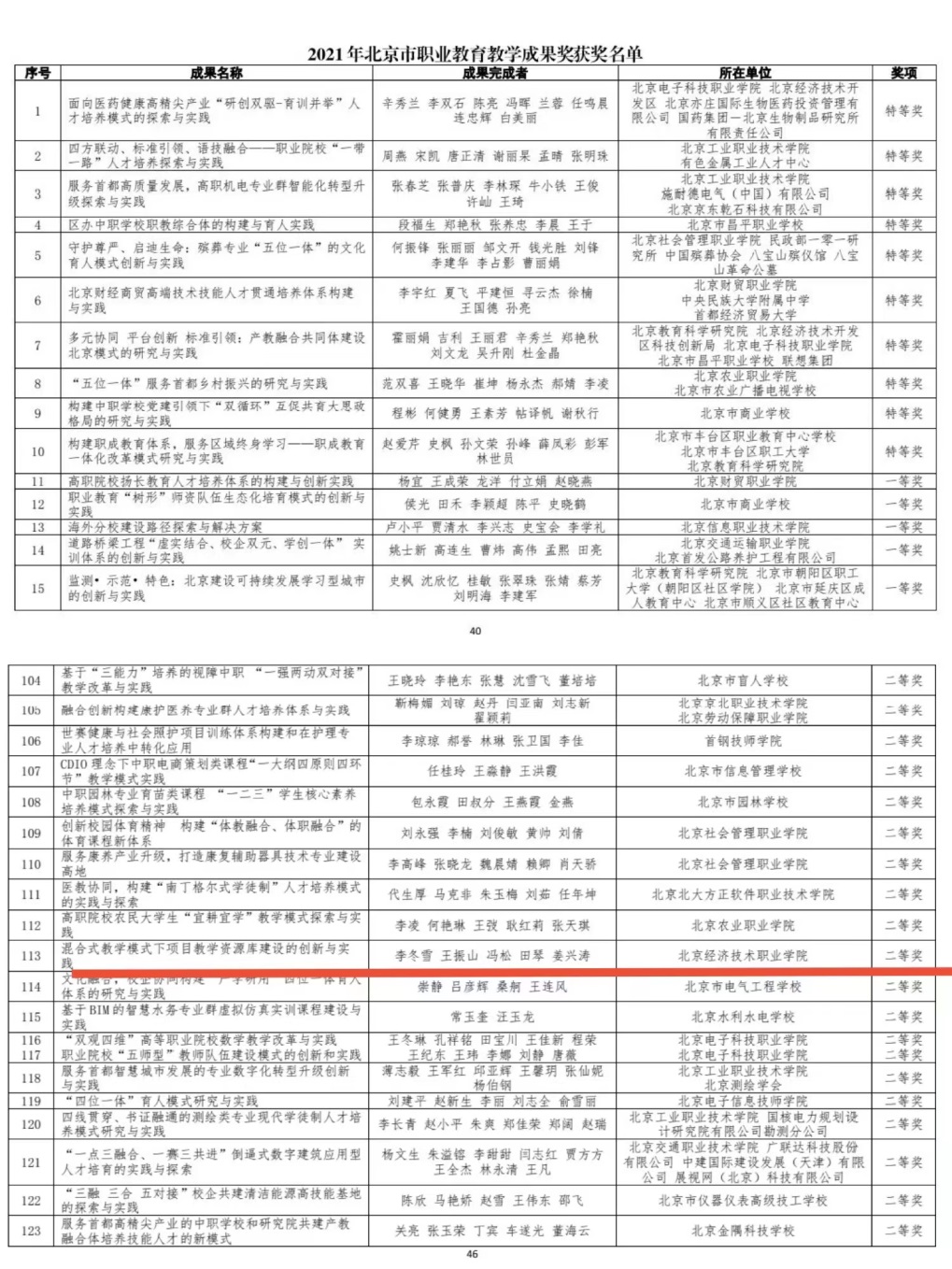近日,北京市教育委员会印发了《关于对2021年北京市教育教学成果奖进行公示的通知》,我校由李冬雪、王振山、冯松、田琴、姜兴涛五人共同完成的《混合式教学模式下项目教学资源库建设的创新与实践》荣获2021年北京市职业教育教学成果二等奖。这是我校继2017年以来在北京市职业教育教学成果奖中再次喜获嘉奖。