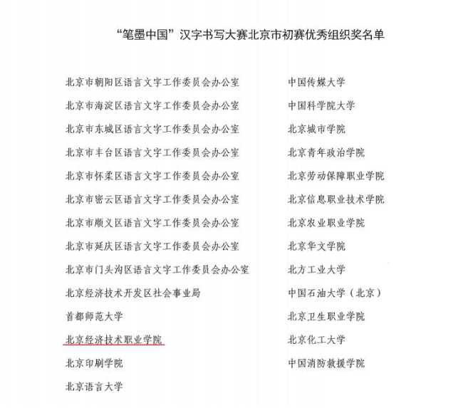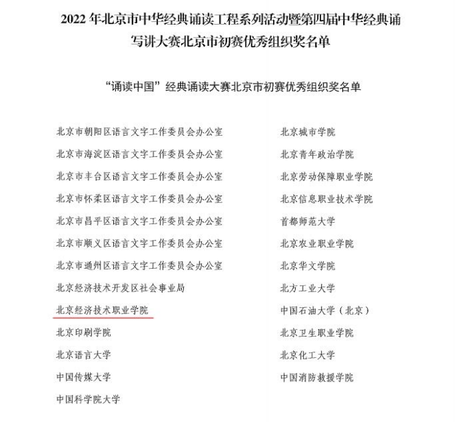 其中,北京市优秀组织单位奖为:“诵读中国”经典诵读大赛北京市初赛优秀组织奖,“诗教中国”诗词讲解大赛北京市初赛优秀组织奖,“笔墨中国”汉字书写大赛北京市初赛优秀组织奖。