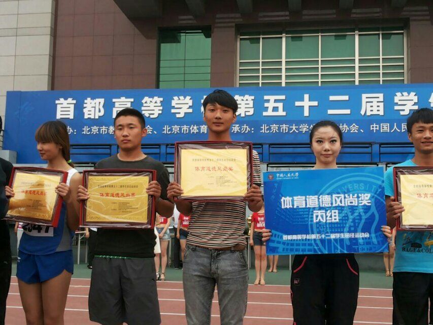 2014年5月15日—18日,在学院领导和各系各部门的支持下,我院田径代表队在领队李国杰,教练胡丽云、陈建春三位老师的带领下参加了在中国人民大学召开的第五十二届首都高校田径运动会。我院田径队荣获丙组女团第七名,男子团体第十名,男女总团体第八名的优异成绩,并获得体育道德风尚奖。