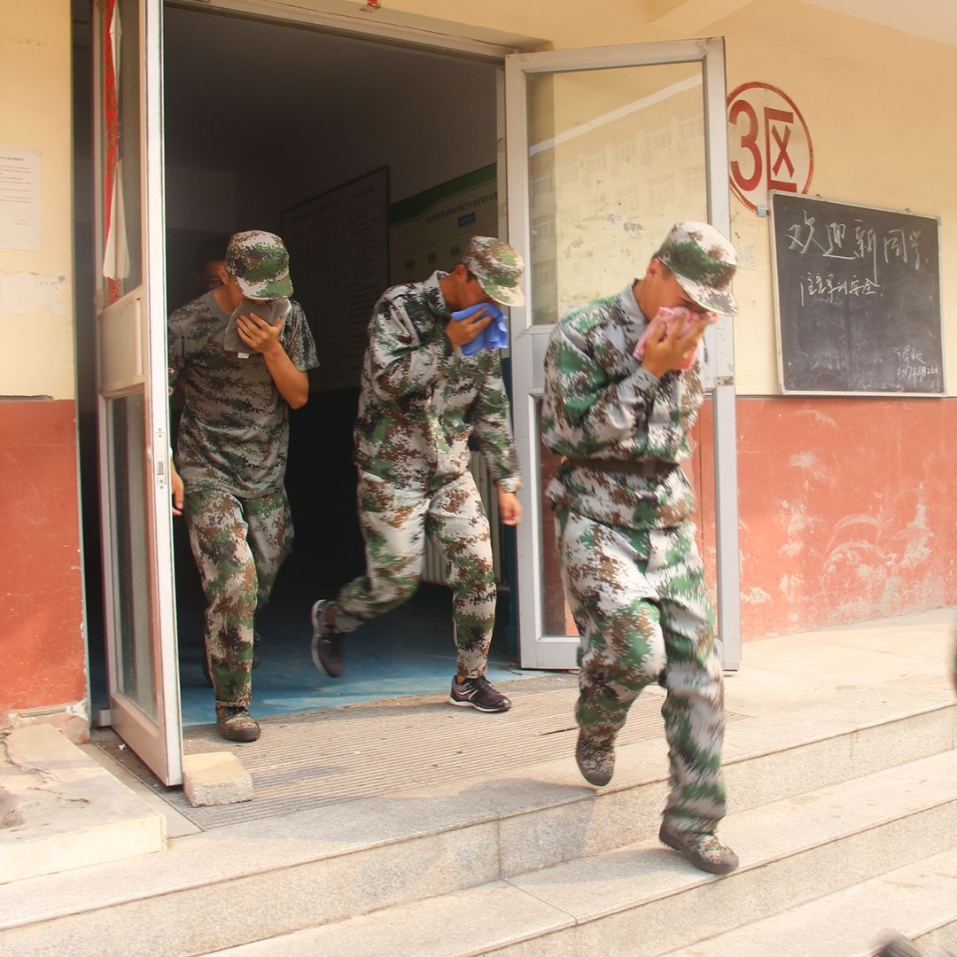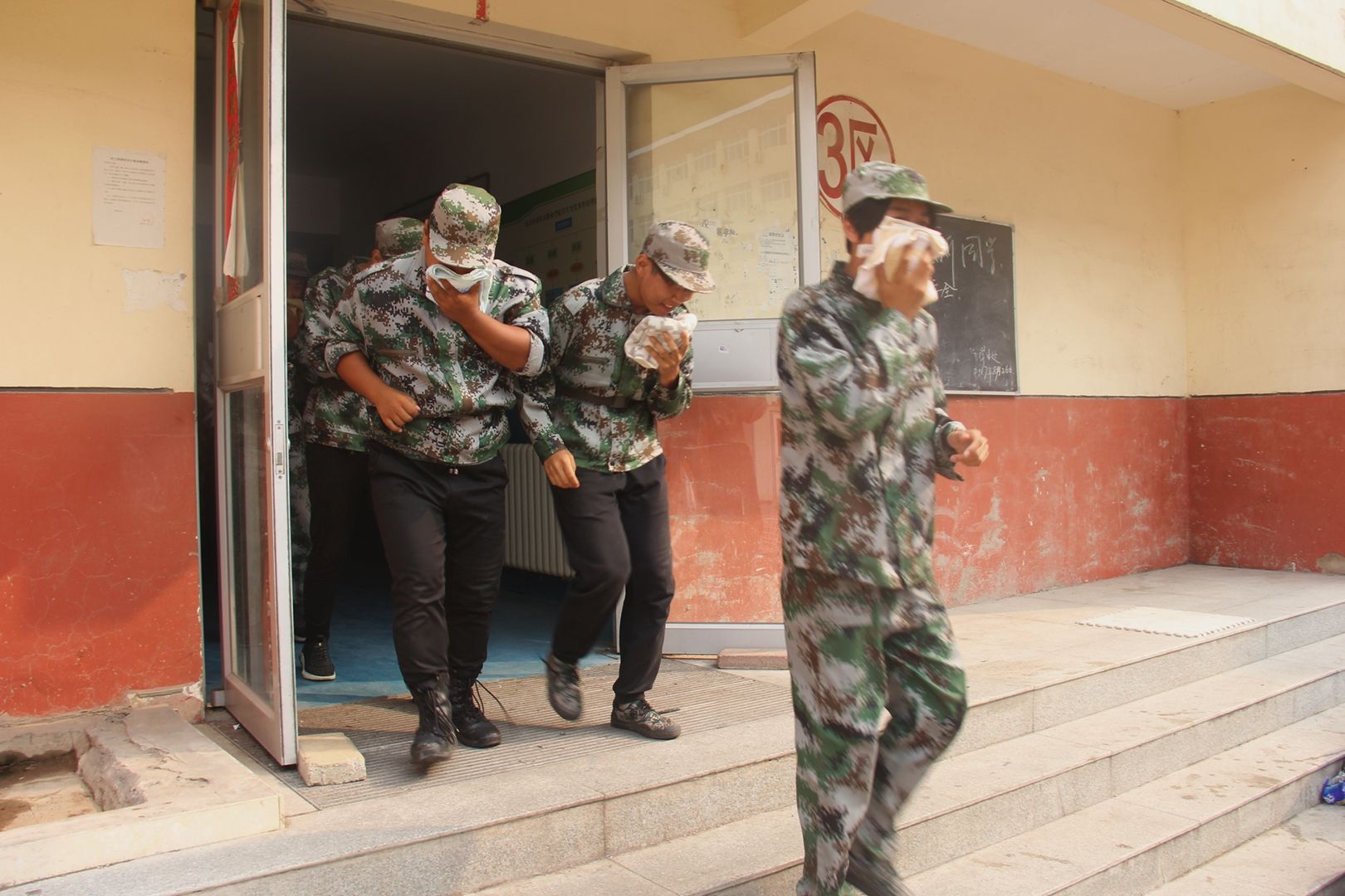 哨声响起,学生们用湿毛巾捂住口鼻,弯腰俯身并按照指定的逃生路线迅速有序地从宿舍撤离,并在指定区域完成集合。