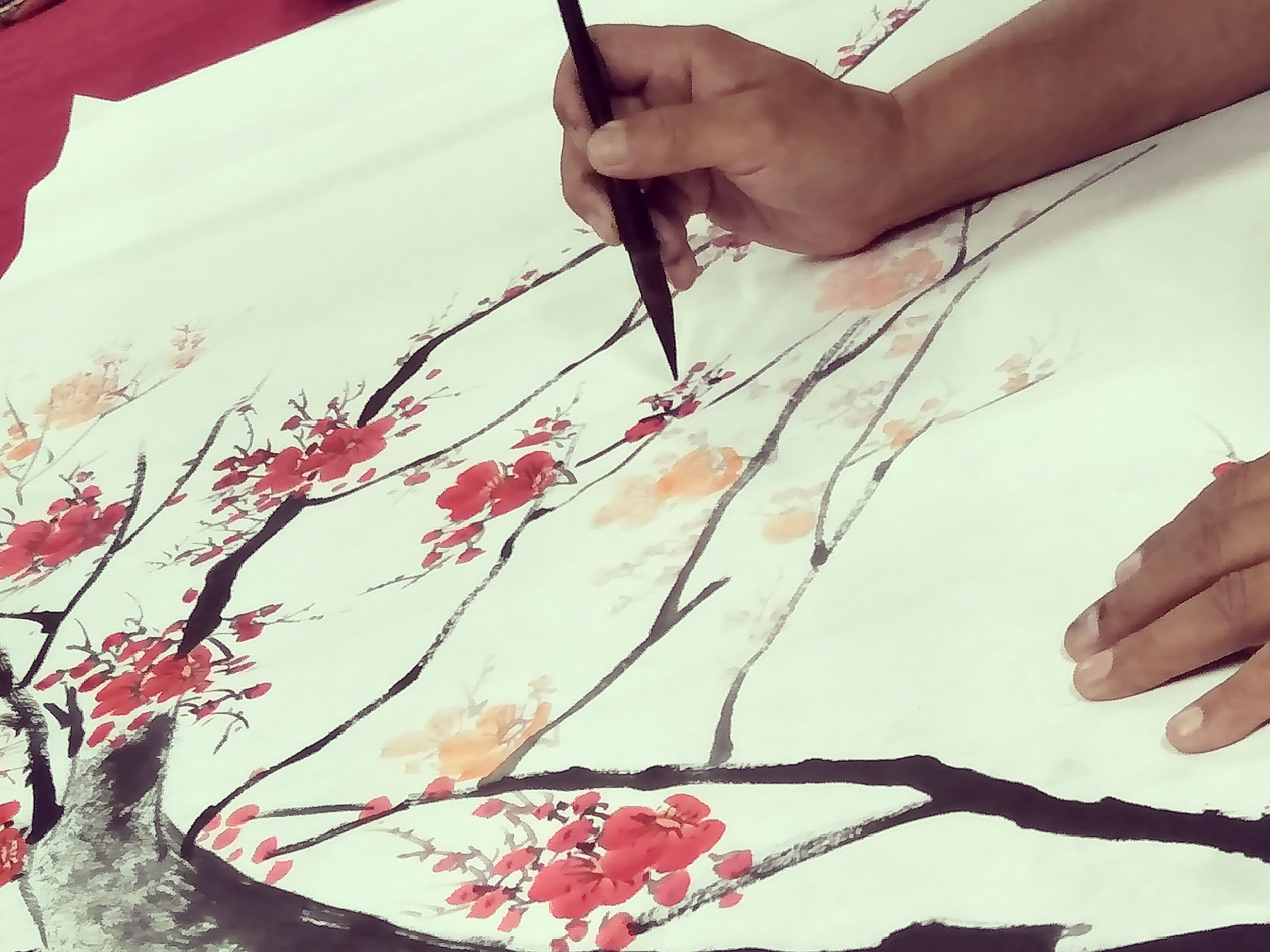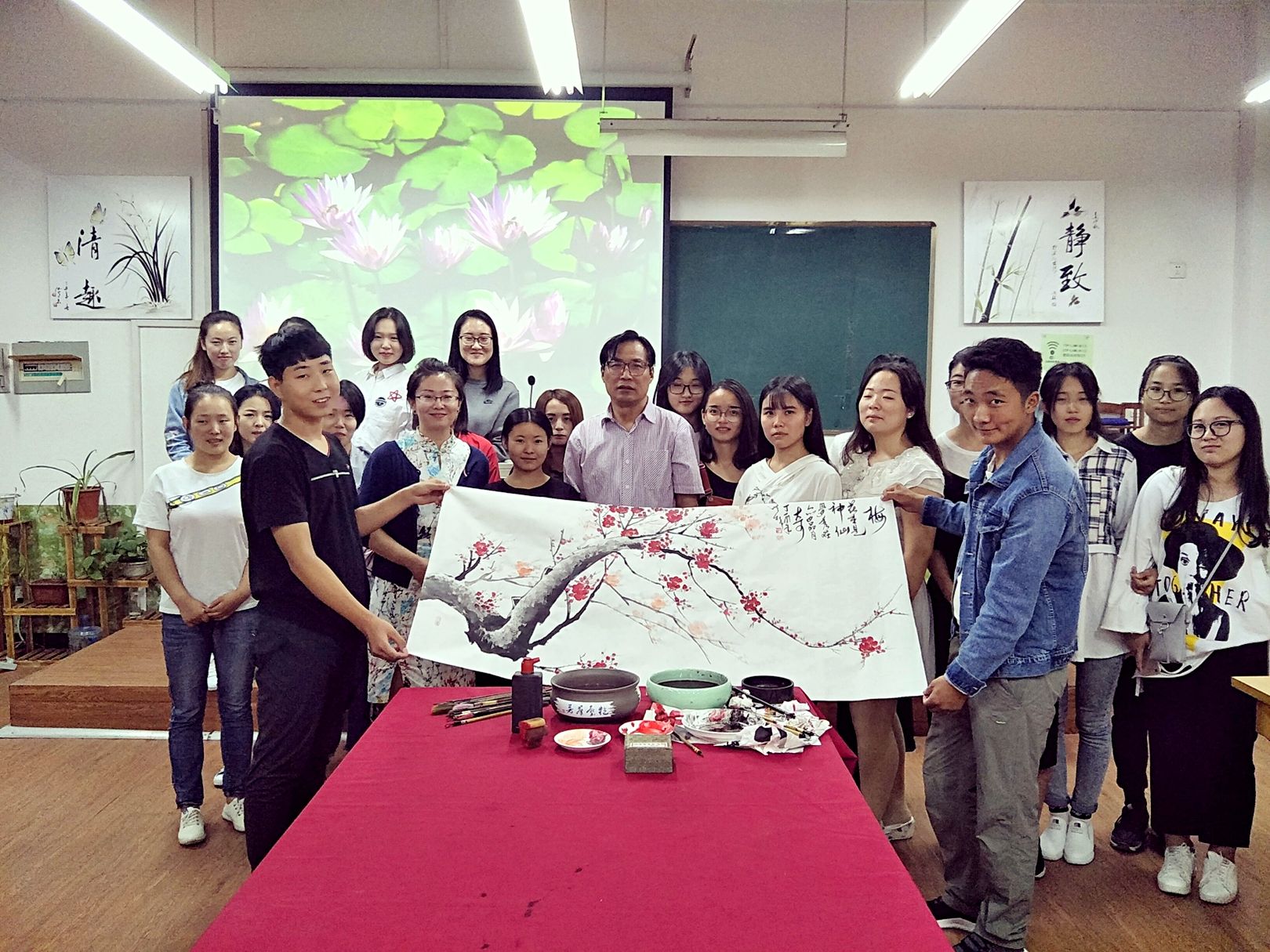 孙教授毕业于天津美术学院,功底深厚,气度十足。课堂上,孙教授细致而不失风趣的概述了梅兰竹菊在国画中的地位及其产生的作用和影响,他铺开笔墨当堂展示梅的画法,一是为了更加形象的讲述画技,二是带领学生走入国画的世界,领略寒梅之傲美。伴着悠扬的古典乐曲,同学们围在孙教授周围,沉浸在他笔下梅花绰约的风姿中……