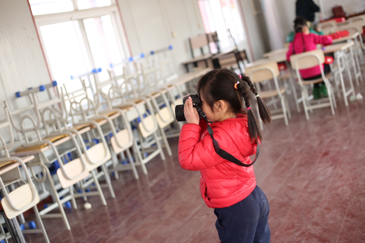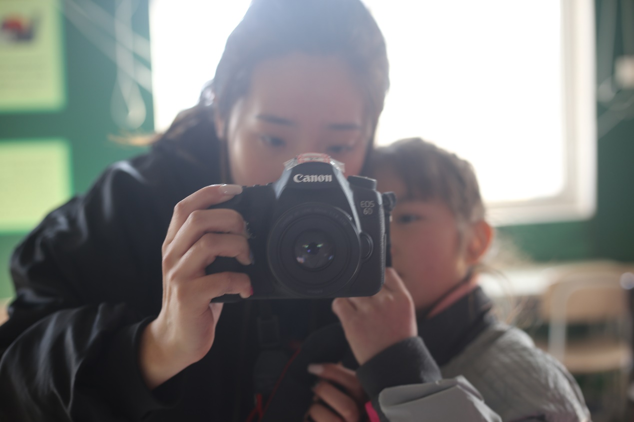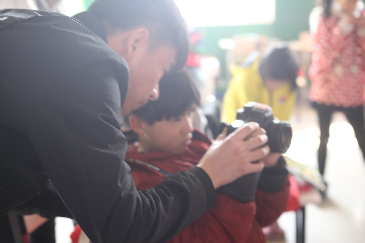 课间休息时,我们还为孩子们带来了摄影手把手教学。他们似乎对拍照特别感兴趣,尤其喜欢和哥哥姐姐一起拍照,当然,在孩子们掌握一定的技巧后,更喜欢亲手拿着相机拍出属于他们自己的作品。