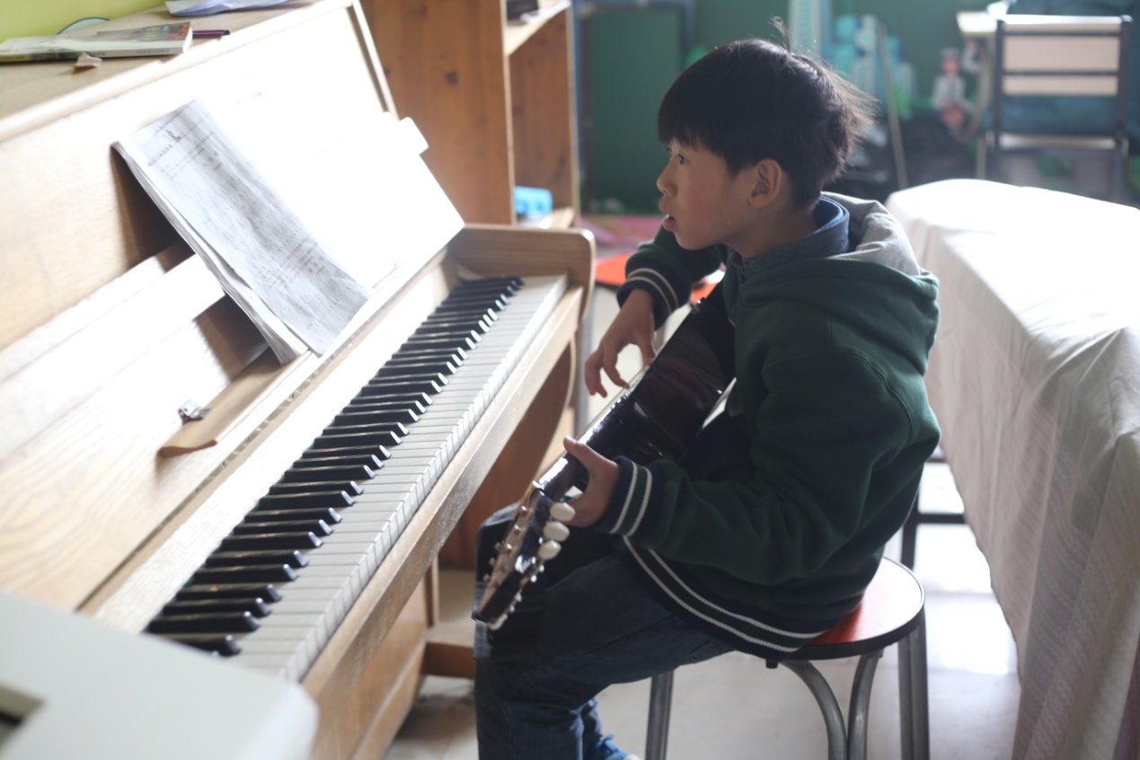 课间,有的孩子去阅读课外读物,有的孩子抱起吉他弹了起来,还有的孩子弹古筝……他们安静认真的样子可爱极了。