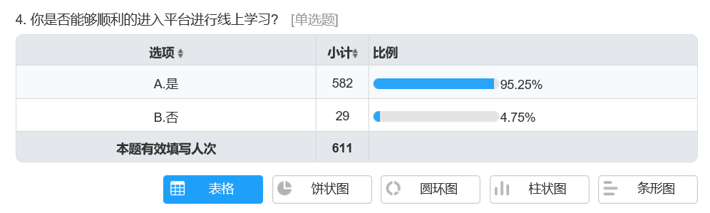 为了进一步了解学生线上学习效果,督导室还特意制定了学生调查问卷,并通过学生信息员的力量,向2018、2019级有在线学习任务的班级发布了调查问卷。问卷共回收了611份,学生参评率超于总人数的70%。