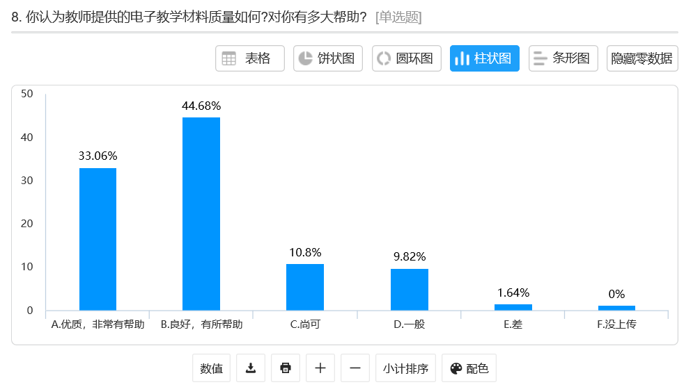 从问卷第8题来看,学生们认为,教师所提供的电子教学材料对他们的帮助很大。这说明教师们在课前准备很充分、教学资料很全面,对学生起到了一定的助学效果。