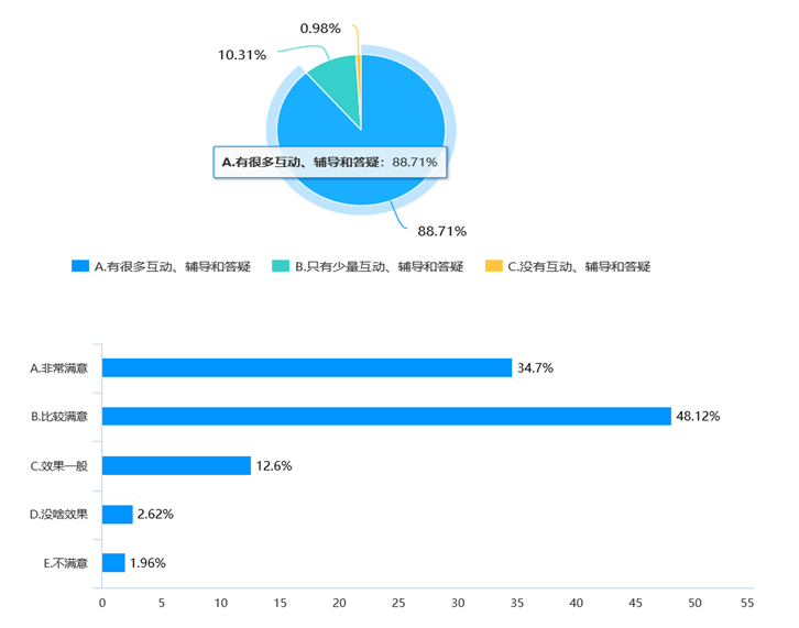 下面两幅图不难看出,线上师生互动确实很积极。即:线上教学同样能够很好地实现师生互动、交流、辅导、答疑等教学活动,而且学生满意度非常高。