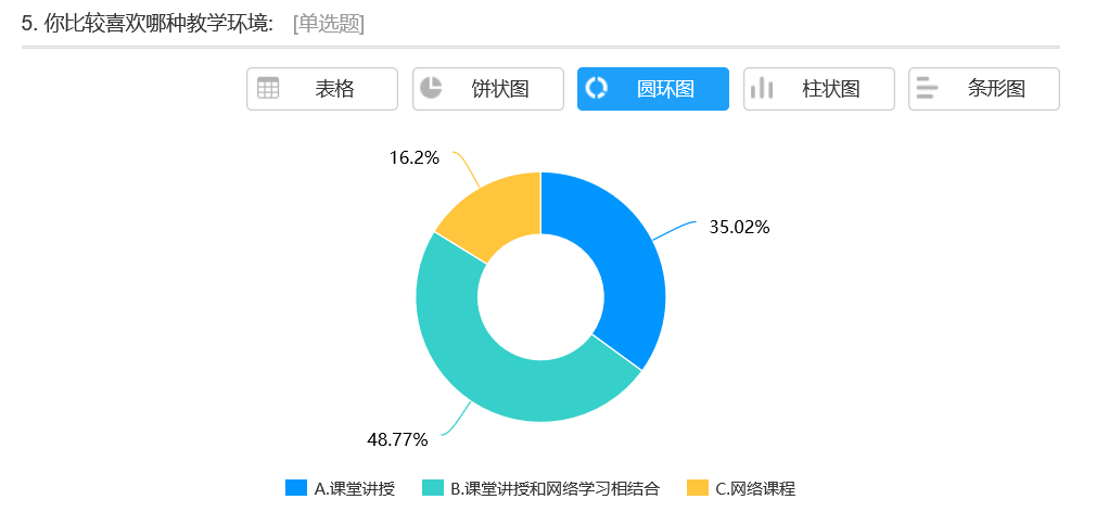 虽然,网络线上教学能够达到“教师不停教,学生不停学”的教学目的,但单纯的网络线上学习确实也存在一些弊端,需要我们在短时间内克服。正如问卷第5题,学生表示更希望接受的是课堂讲授与网络学习相结合的模式,这正是我们几年来一直所提倡的线上与线下相结合的混合式教学模式。
